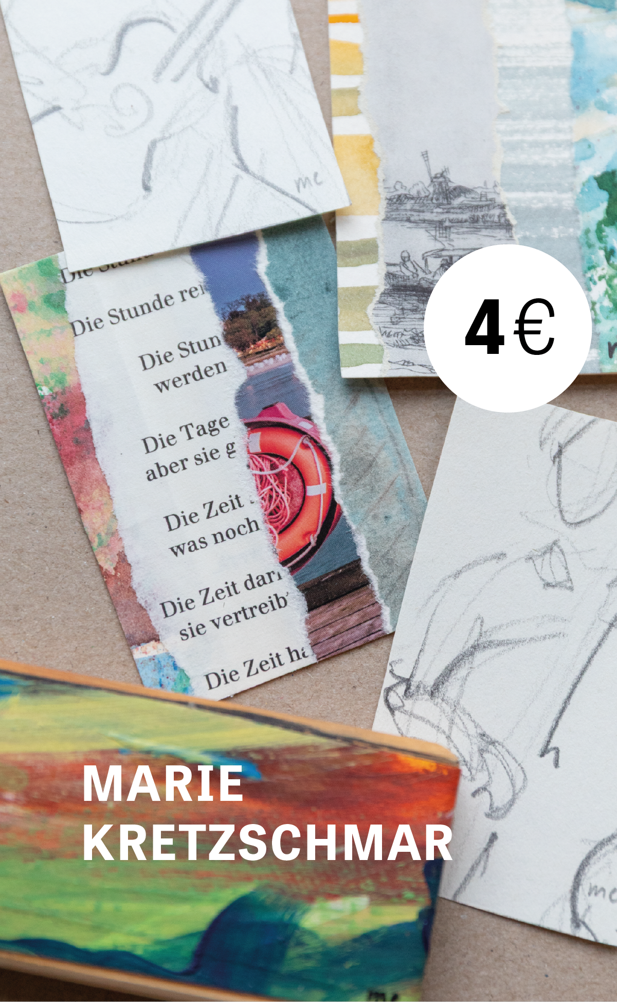 Marie Kretzschmar (geborene Marie Eberling, daher das Künstlerkürzel "me") verbringt gerne Zeit damit, ihre Umgebung wahrzunehmen, Besonderheiten und unwichtige Details aufzusaugen und fotografisch oder zeichnerisch Momente daraus festzuhalten. Für den Artomaten hat sie Mixed-Media-Arbeiten (Acryl auf Leinwand und Holz) sowie eine Collage-Reihe (Aquarelle, Prospekte, Buchseiten) zum Leben erweckt.